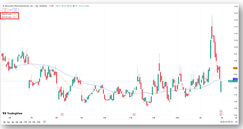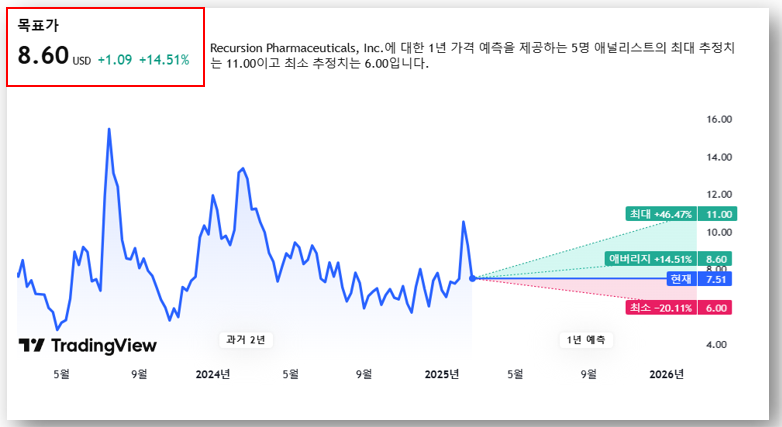 기관들은 리커젼의 AI 신약 개발 잠재력을 높이 평가하며 $10~$12의 목표가를 제시하고 있습니다. 현재 주가($7.51) 대비 +40~60% 상승 여력이 있는 것으로 분석됩니다.