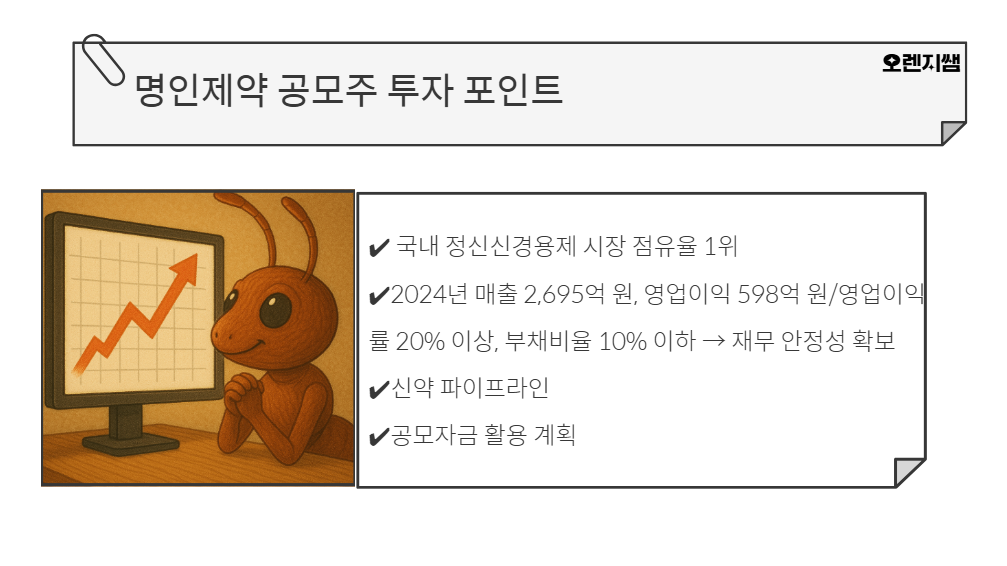 명인제약은 국내 정신신경용제 시장 1위 기업으로, 안정적인 매출 기반과 신약 파이프라인을 동시에 보유한 점이 투자 매력 포인트입니다.