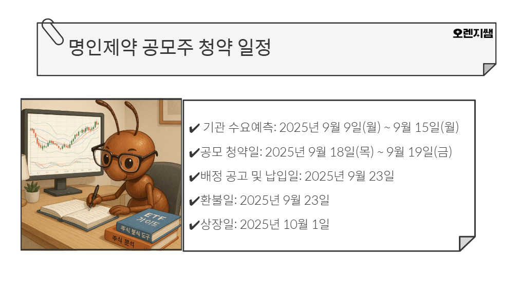 이번 포스팅에서는 명인제약의 기업 개요, 청약 공모 정보, 투자 포인트와 리스크, 청약 일정에 대해 알아볼테니, 참고바래요!