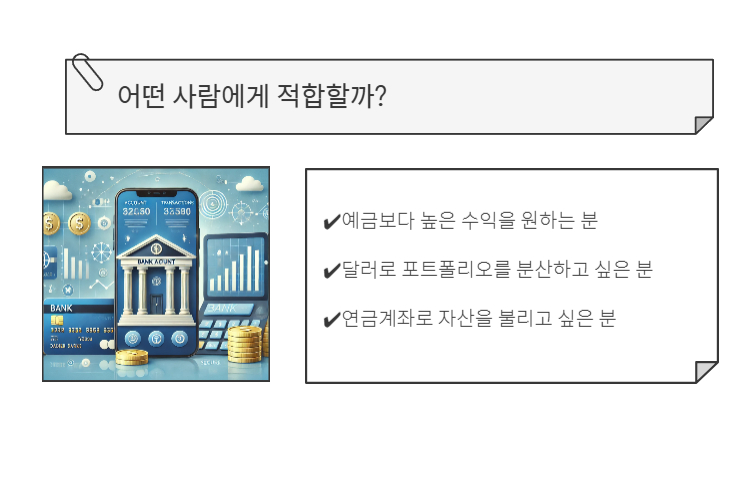 2025년 3월 기준 연 4% 이상의 금리 수익을 달러로 받을 수 있고, 연금계좌에도 투자 가능해서 중장기 투자처로 주목받고 있어요.