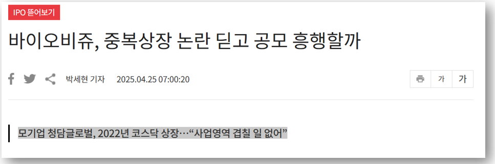 - 모회사 청담글로벌과의 중복상장 우려