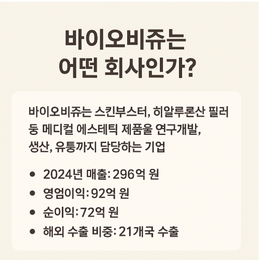 바이오비쥬는 스킨부스터, 히알루론산 필러 등 메디컬 에스테틱 제품을 연구개발, 생산, 유통까지 담당하는 기업인데요, 2018년 설립된 이래로 미용의료기기 시장에서 빠르게 성장해 왔으며, 주요 제품군에는 ▲칸도럽 ▲아세나르트 ▲코레나 등의 브랜드가 포함됩니다.