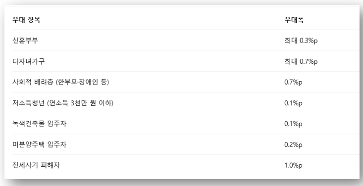 - 신혼부부, 생애최초구입자, 다자녀가구 등 우대금리 제공