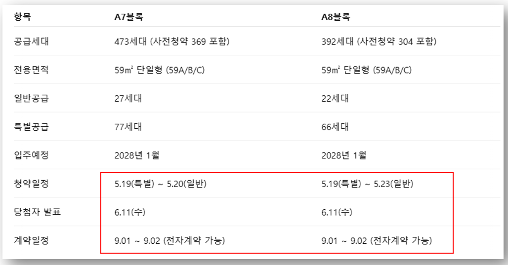이번 청약은 A7블록 473세대, A8블록 392세대로 진행되며, 전용 59㎡ 단일면적, 특별공급 비중이 높은 구조로 무주택 실수요자에게 최적화된 기회입니다.