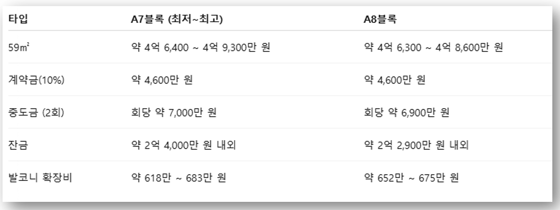 ✅ A7, A8 블록 분양가 정리 비교표