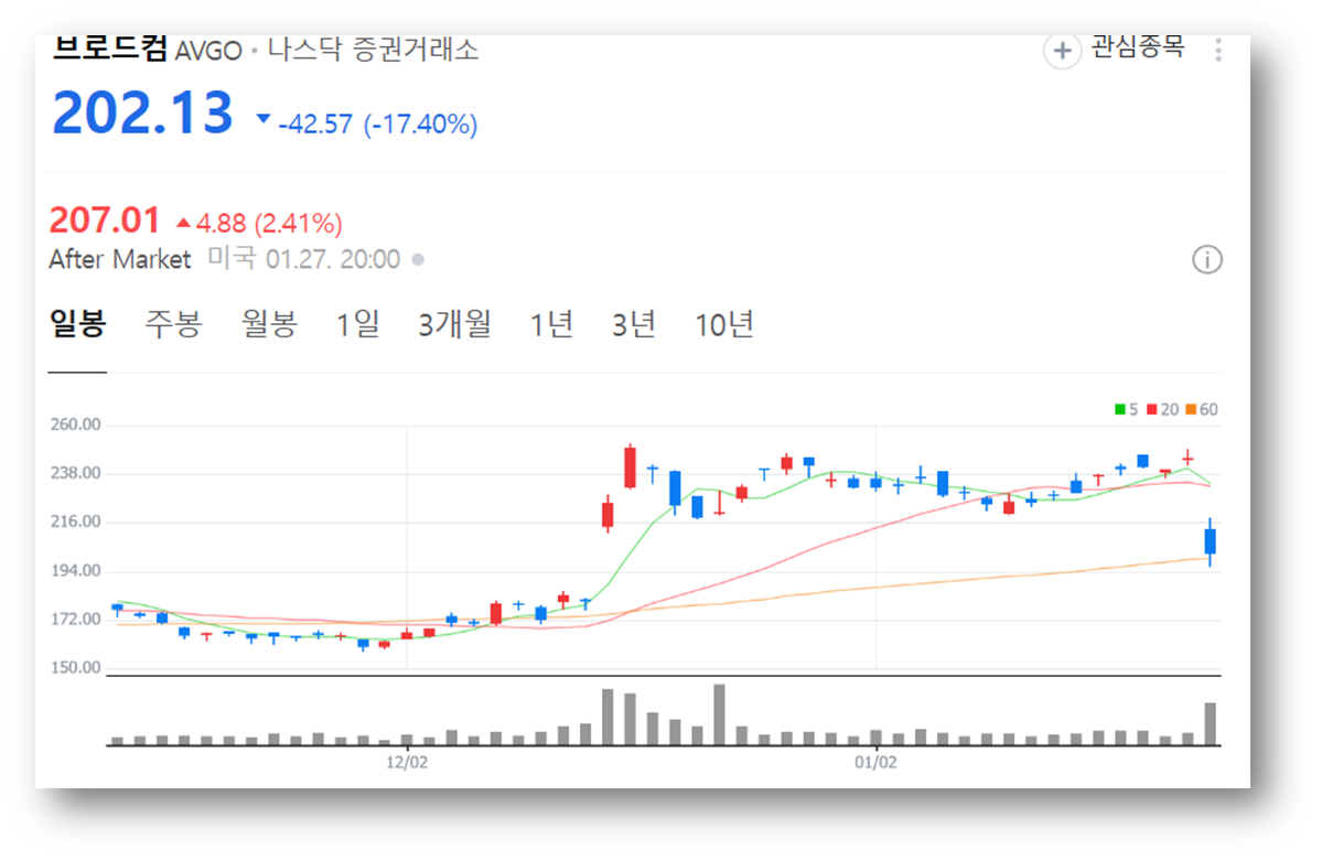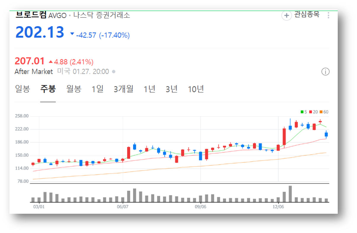 27일(현지시간) 뉴욕증시에서 브로드컴 주가가 17.40% 폭락해 $202.13로 마감했는데요, 이로 인해 시가총액도 9474억 달러로 감소였습니다.