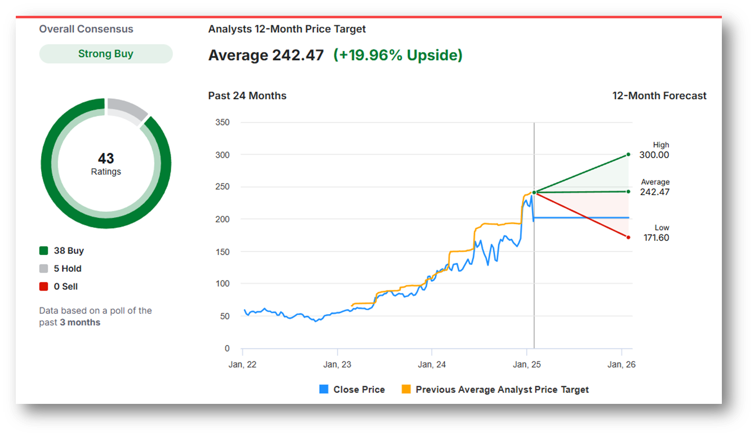 브로드컴의 12개월 평균 목표주가는 $242.47로 현재 주가($202.13) 대비 약 +19.96% 상승 여력이 있습니다. 최고 목표주가는 $300.00으로, 낙관적인 경우 약 +48.4% 상승 가능성이 있으며, 최저 목표주가는 $171.60으로 약 -15.1% 하락 가능성을 보여줍니다. 애널리스트 43명 중 88%가 매수, 12%가 보유, 매도 의견은 없으며, 전반적으로 긍정적인 전망입니다.