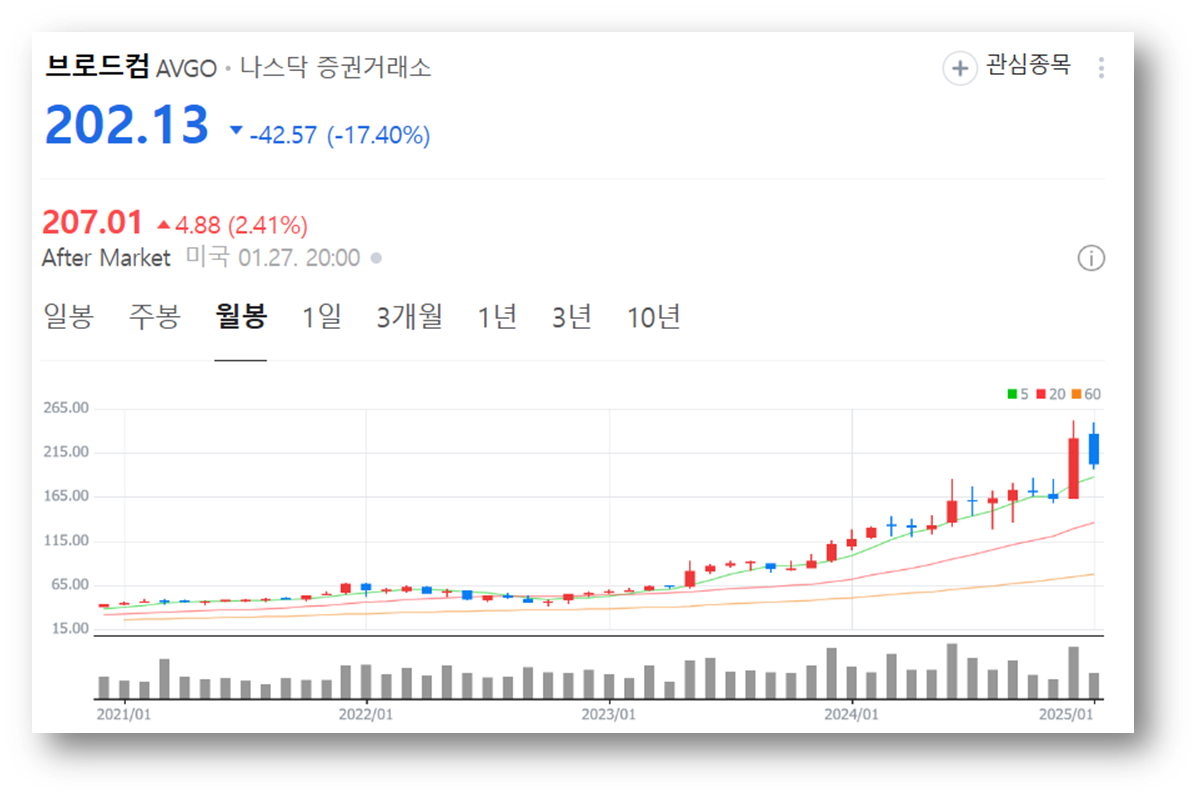 브로드컴은 최근 AI 전용 칩 개발 성공으로 주가가 급등하며 시총 1조 달러를 돌파하고 미국 기업 시총 8위까지 오르는 등 AI 수혜주로 주목받았습니다. 하지만, 중국 딥시크가 비용 대비 우수한 AI 챗봇 기술을 개발했다는 소식이 전해지며, 엔비디아와 함께 고평가 논란에 휘말리며, 17%가 넘는 폭락을 맞이했습니다.