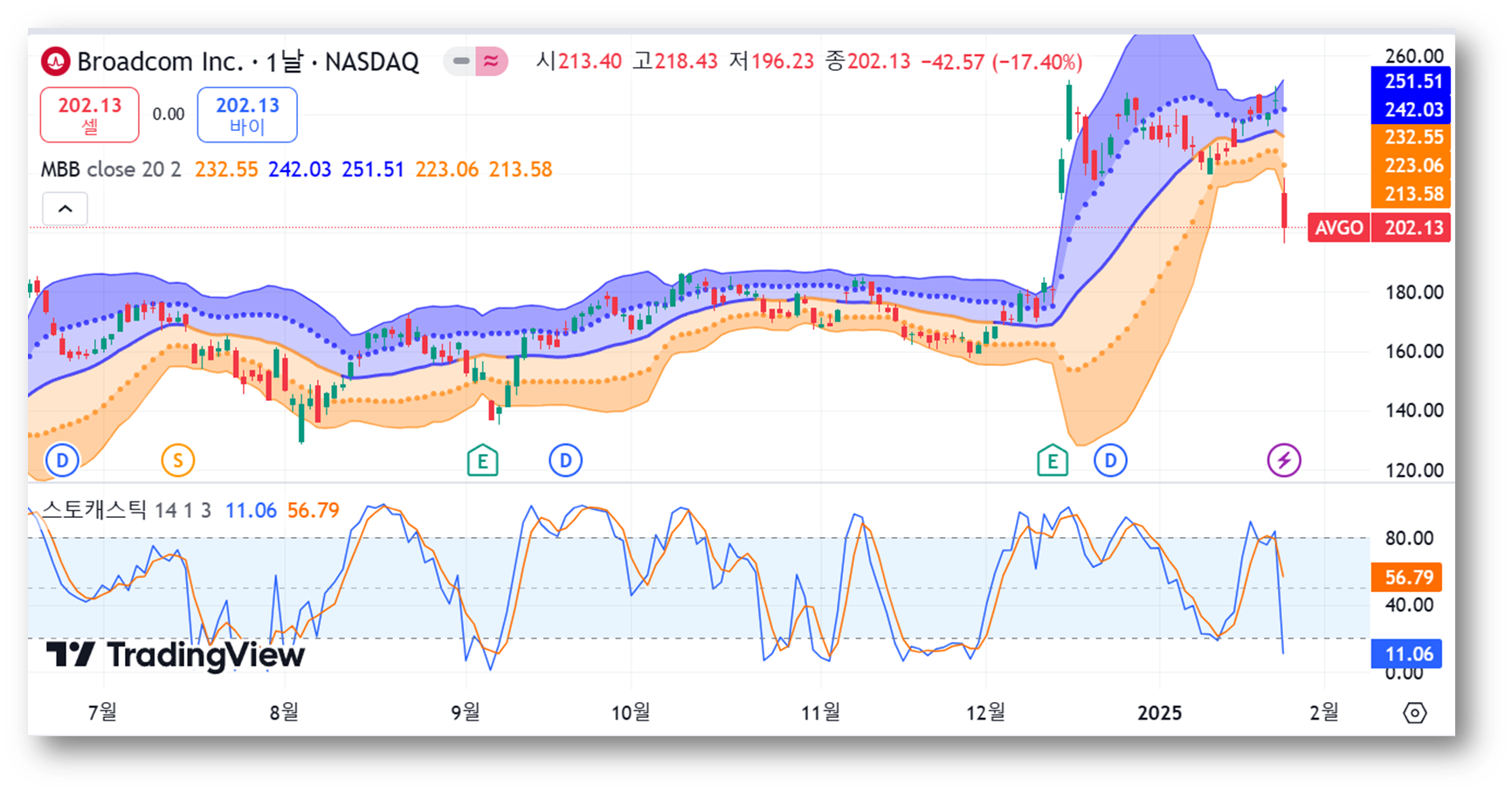 - 종가 $202.13는 하단 밴드($213.58)를 하회한 상태로, 이는 주가가 과매도 상태에 진입했음을 의미합니다.