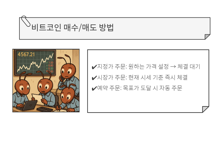- 지정가 주문: 원하는 가격 설정 → 체결 대기
