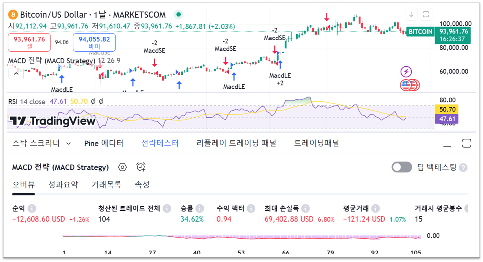 • 지지선: MACD가 추가로 하락하면서 히스토그램이 더 커질 경우, 주가는 50일 이동평균선(93,693.49 USD) 아래로 내려갈 가능성이 커보입니다.