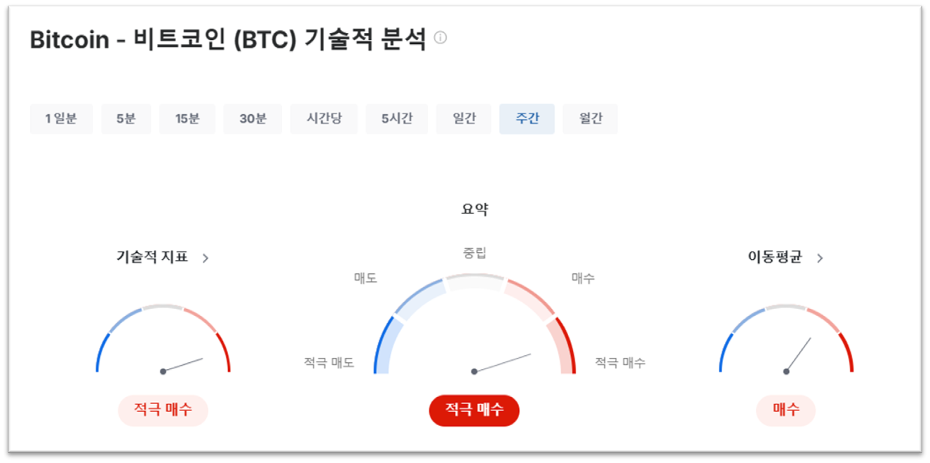 일간 데이터로만 봤을 때, 기술적 지표에서는 적극 매도, 이동평균선으로 봤을 때는 중립입니다. 대체적으로 매도의 의견이지만, 좀 더 중장기적인 데이터를 봐야하기 때문에 주간 데이터 분석으로 넘어가 볼까 합니다.