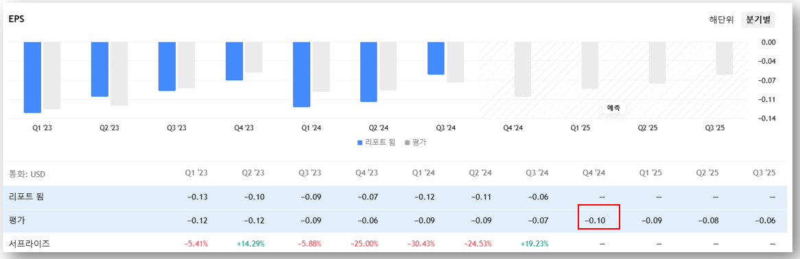- Q4 2024 예상 EPS: -0.10 USD (적자 지속)