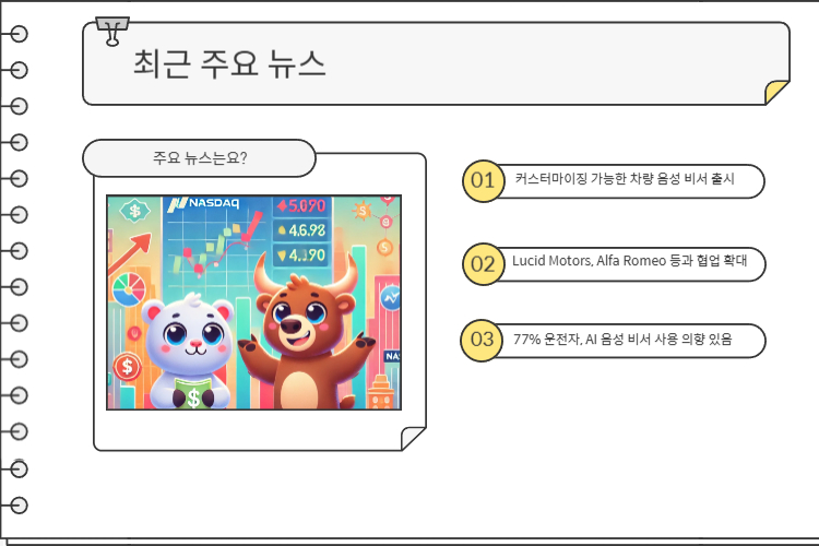 사운드하운드AI(SOUN)는 자동차 및 다양한 산업군에서 활용되는 음성 인공지능(AI) 기술을 제공하는 기업입니다. 특히 자동차 업계와의 협업을 통해 AI 음성 비서를 차량에 적용하는 기술을 선도하고 있으며, 최근 맞춤형 차량 음성 비서 기능을 발표하며 시장에서 주목받고 있습니다.