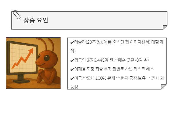 최근 삼성전자가 테슬라·애플과의 대규모 계약, 외국인 매수세 전환, 사법 리스크 해소 등 굵직한 호재를 연이어 발표하며 주가가 강세를 보이고 있습니다.