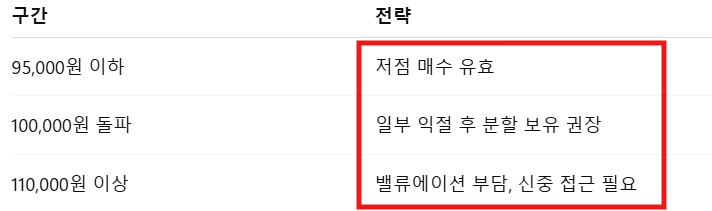 ✔️ 단기 트레이더: 10만 원 부근 이익 실현 전략 필요