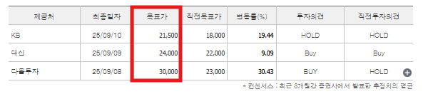 평균 목표가는 24,325원. 현재 주가 대비 약 8.8% 이상 추가 상승 여력 존재. 한국투자증권은 밸류에이션 갭 해소 기대감을 가장 높게 반영.