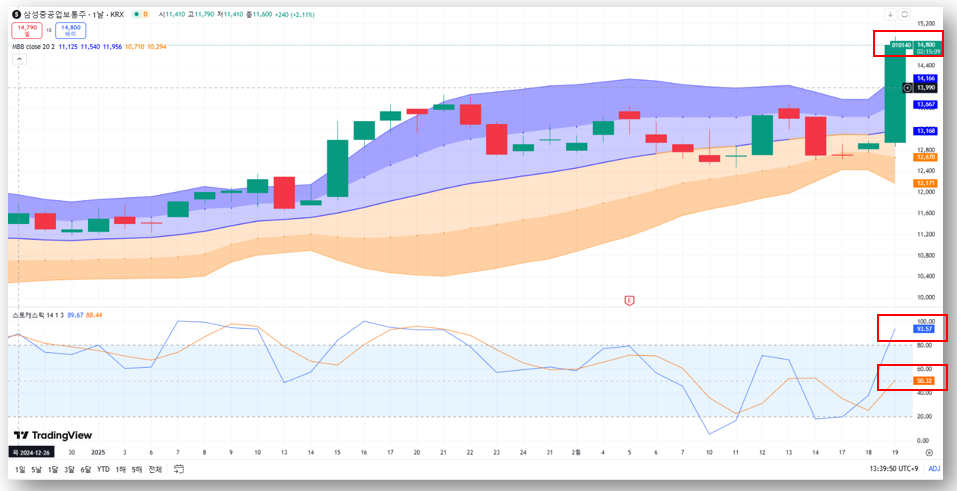스토캐스틱(93.57) 과매수 구간 진입 → 단기 조정 가능성 있음