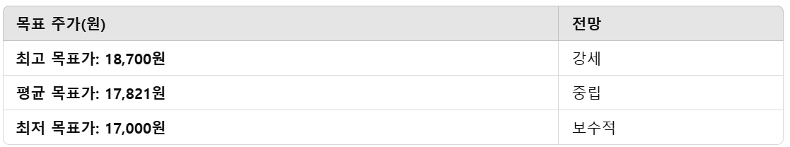 📌 현재 증권사들의 평균 목표 주가는 17,821원으로 현재 주가(14,790원) 대비 약 20% 상승 여력이 있습니다.