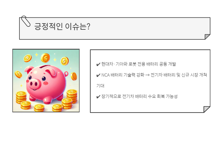 ✔ 현대차·기아와 로봇 전용 배터리 개발 협력 → 신규 시장 개척 기대