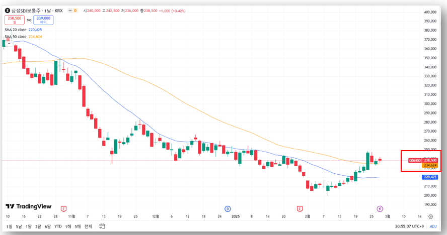 삼성SDI의 주가는 최근 하락세를 보이며 23만 원대에 머물러 있는데요, 하지만 현대차·기아와의 로봇 전용 배터리 개발 협력, NCA(니켈·코발트·알루미늄) 배터리 기술력 강화, 전기차 배터리 시장 성장 기대감 등이 긍정적인 요소로 작용할 가능성이 보이면서, 반등을 시도하고 있는데요,