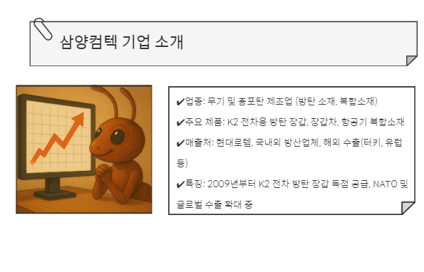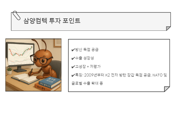 삼양컴텍은 방탄 장갑 독점 공급 + 방산 수출 확대 + 실적 고성장이라는 3박자를 갖춘 기업입니다.