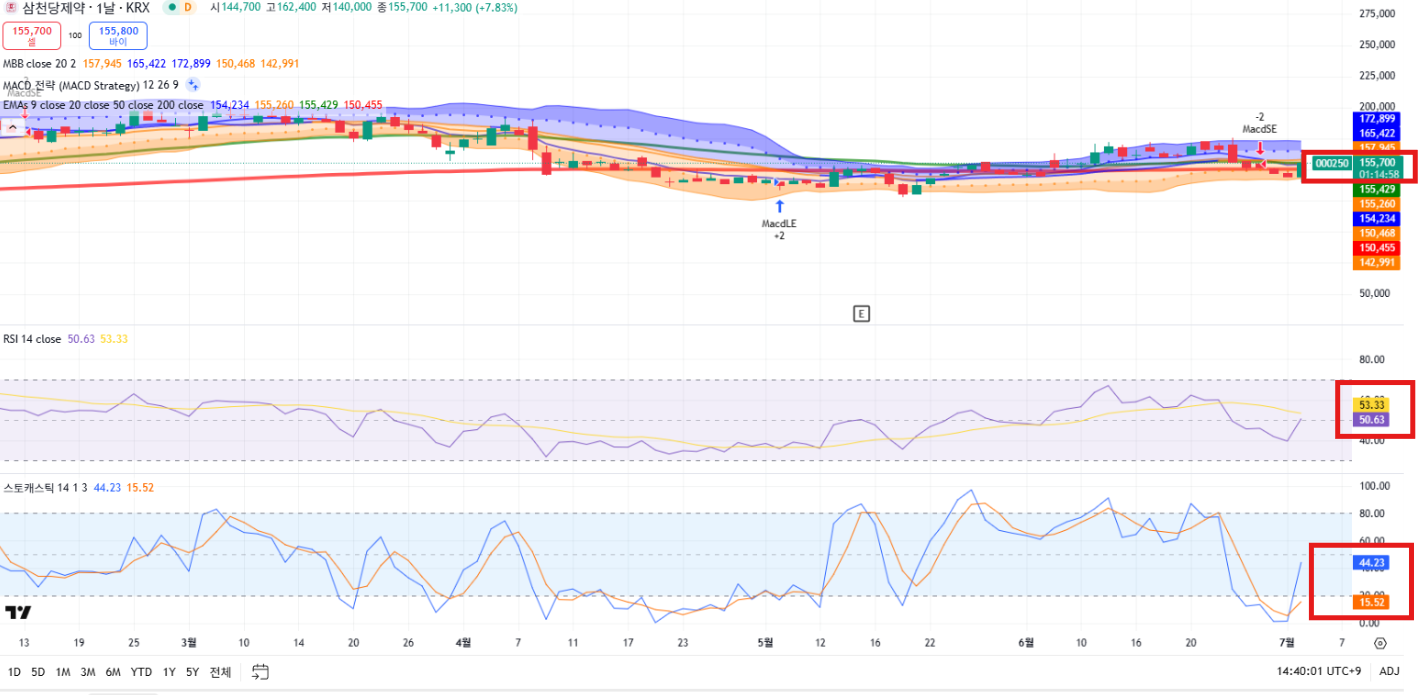 - RSI 49.76, 스토캐스틱 44.16으로 회복 구간