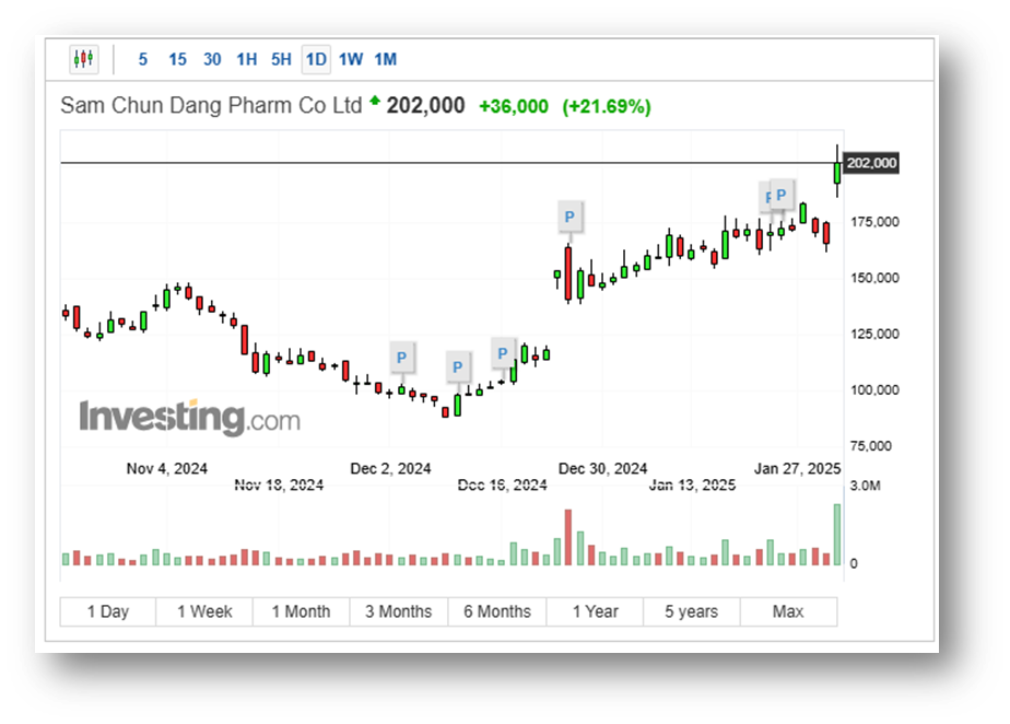 삼천당제약은 2025년 2월 5일과 6일 양일간 국내 기관투자자를 대상으로 SCD411(아일리아 바이오시밀러)S-PASS 플랫폼 기반 비만 및 당뇨 치료제 개발 상황에 대한 IR을 진행했습니다. 이 발표로 인해 주가는 하루 만에 23.19% 급등하며 20만 4500원에 거래를 마쳤습니다.