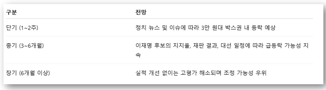- 실적 개선 모멘텀 없음, 오직 정치 테마에 의존한 급등세이므로 펀더멘털 기반 투자자는 신중히 판단 필요.