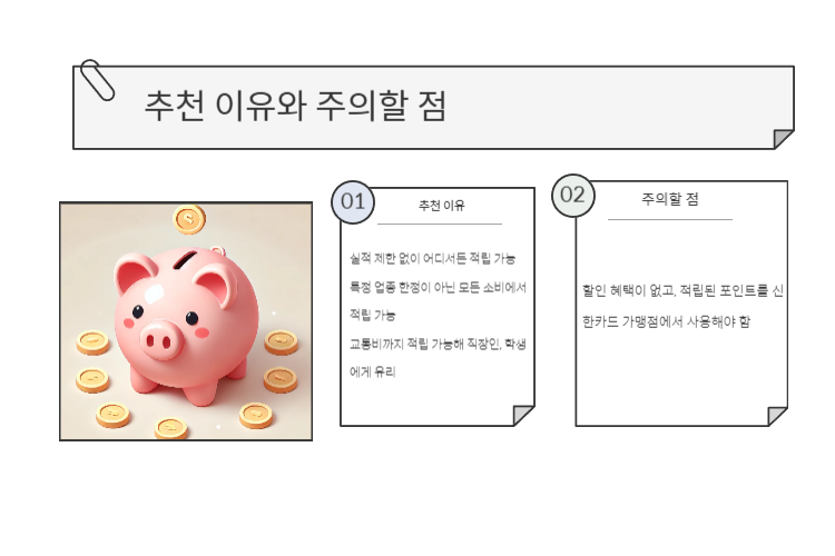 - 할인 혜택이 없고, 적립된 포인트를 신한카드 가맹점에서 사용해야 함