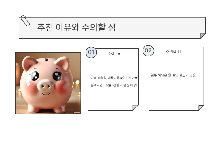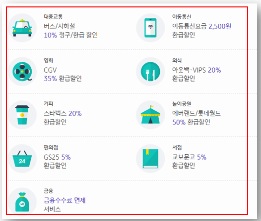 - 대중교통·배달·카페·영화 할인 혜택이 풍부