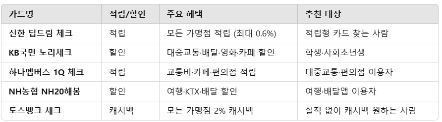 체크카드는 신용카드처럼 간편하면서도 과소비를 방지할 수 있어 많은 사람들이 선호하는 결제 수단인데요, 최근에는 포인트 적립, 캐시백, 교통비 할인, 해외결제 혜택까지 다양한 부가서비스