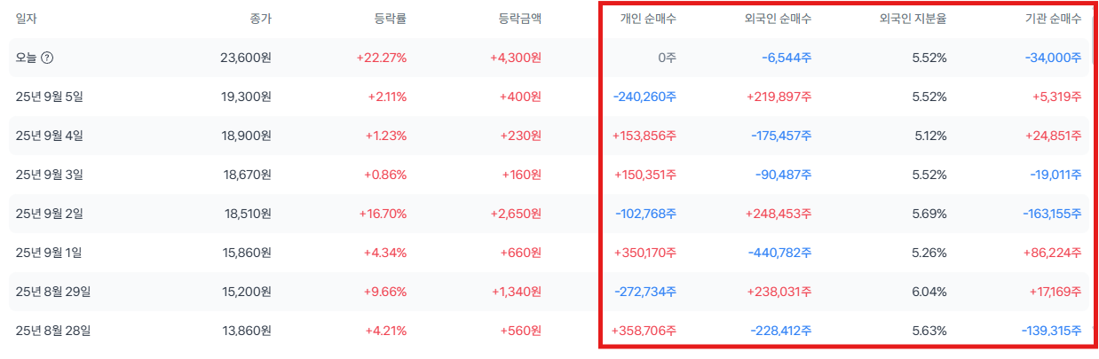 - 외국인: 순매수 약 +22만 주 (상승세 견인)