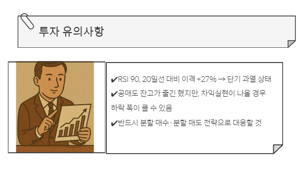• RSI 90, 20일선 대비 이격 +27% → 단기 과열 상태