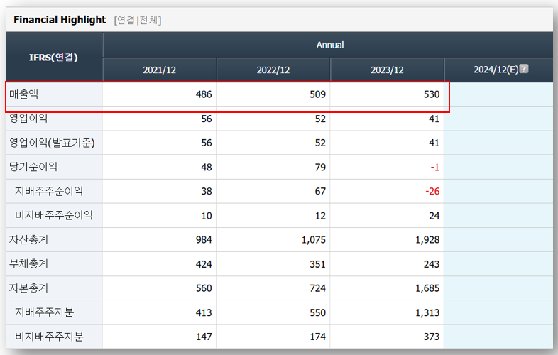 - 2024년 매출 성장 전망: 매출이 2023년 509억에서 2024년 530억으로 증가 전망.