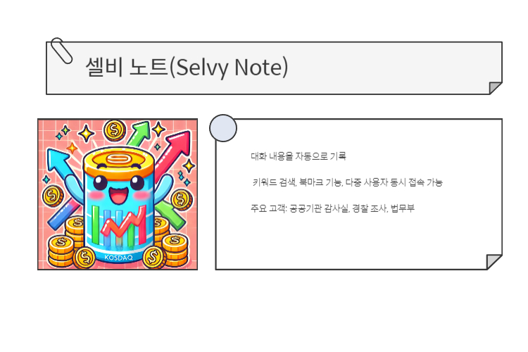 - 셀비 노트: 대화 내용을 AI 음성인식 기술로 실시간 기록하며 보안성을 갖춘 온프레미스 방식과 온디바이스 방식을 제공합니다.