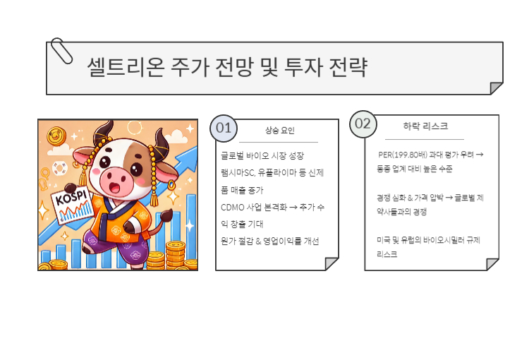 셀트리온은 실적 성장과 신사업 확장에 따른 중장기 상승 가능성이 높은 종목입니다. 다만 현재 주가가 높은 PER을 반영하고 있어 단기 변동성이 클 수 있으므로 신중한 투자 전략이 필요합니다.