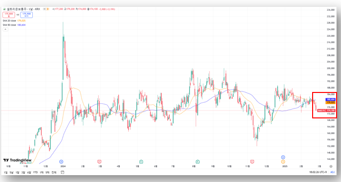 최근 주가는 17만 원대에서 횡보하는 모습을 보이고 있으며, 52주 최고가(20만 원대) 대비 약 10% 하락한 상태입니다. 하지만 램시마SC, 유플라이마 등 신제품의 성장 기대감과 글로벌 바이오 시장 확대에 따라 중장기적인 상승 가능성이 예상됩니다.