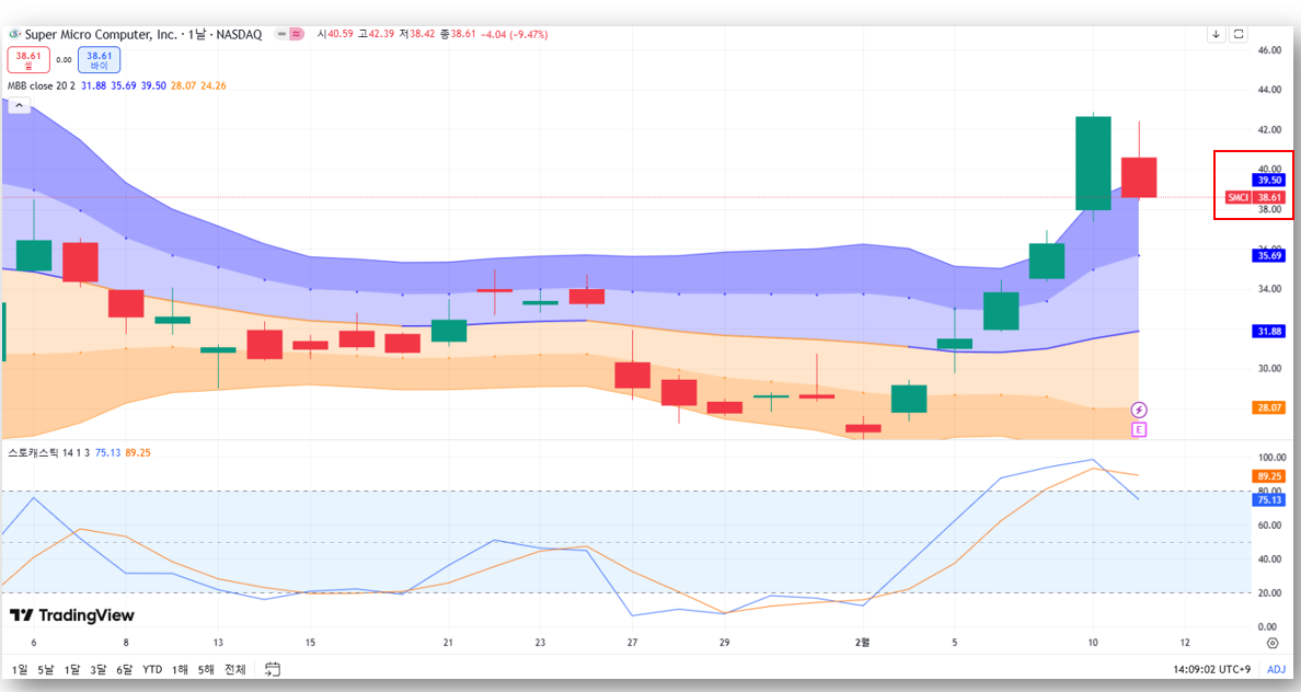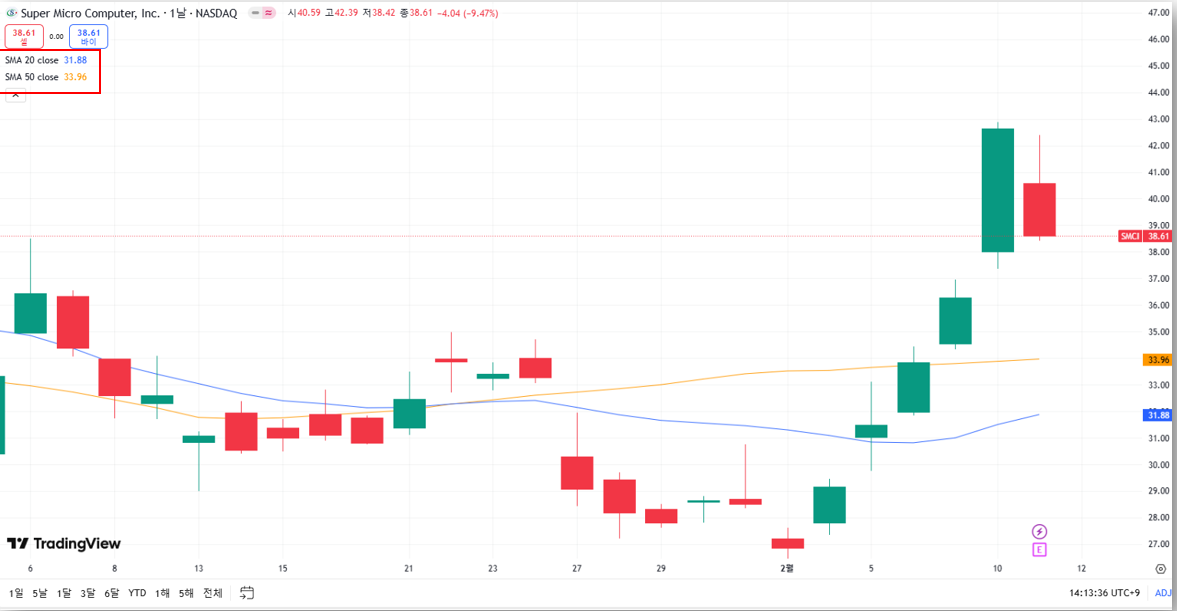2월 12일 기준, SMCI는 38.61달러로 -9.47% 급락, 그러나 시간외 거래에서 +8% 반등하며 41.66달러 기록하고 있습니다.