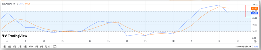 과매수 구간(89.25) 진입 후 하락 조정 중