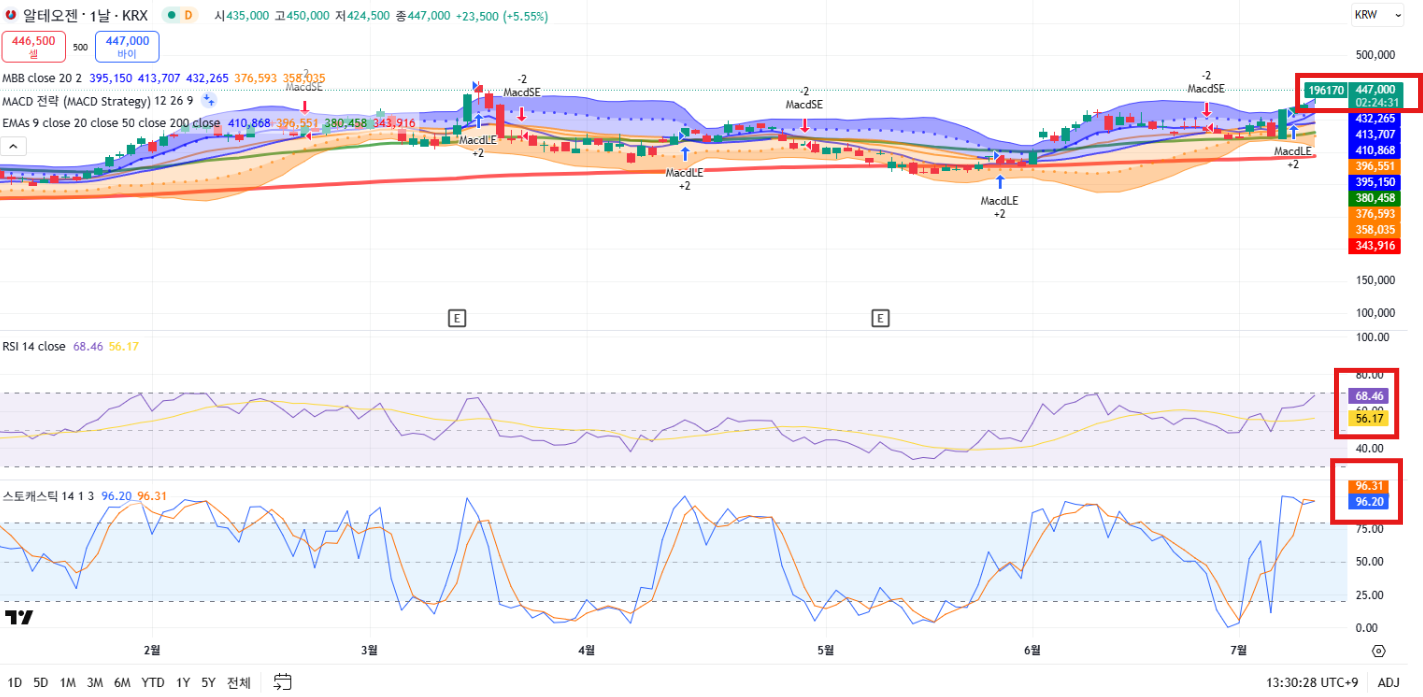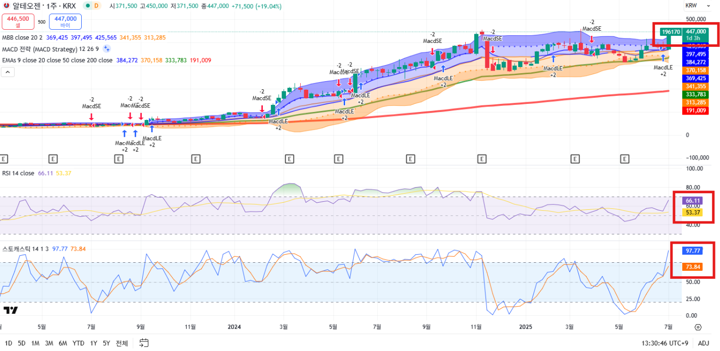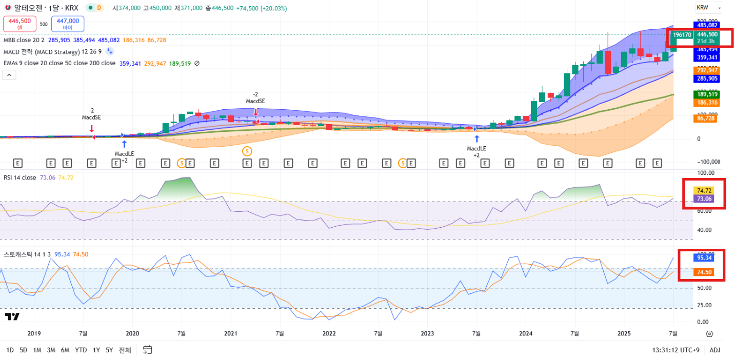 - Stochastic 81.2 / RSI 69.1 → 강한 상승 모멘텀
