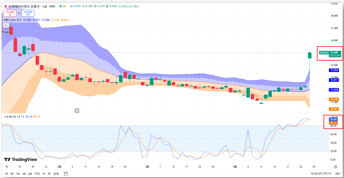 - 2025년 4월 24일 기준, 종가 15,040원(+22.18%) 기록