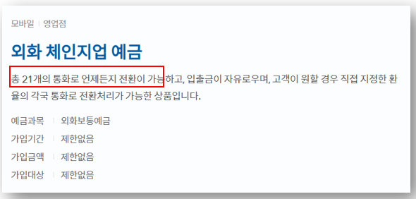 - 21개 외화로 입출금이 자유롭고, 고객이 원하는 환율로 직접 지정하여 환전 가능