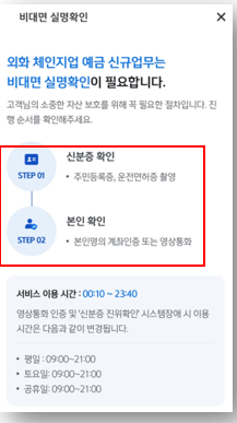 - STEP 2: 본인 확인 (계좌 인증 또는 영상통화)