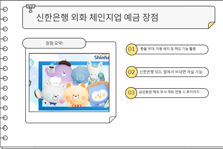 요즘 해외 주식 투자나 외화 자산을 운용하는 분들이 많아지면서 외화 입출금이 자유로운 통장이 필요해졌습니다. 신한은행의 외화 체인지업 예금은 이러한 니즈를 반영한 대표적인 외화 입출금 상품인데요. 특히, 삼성증권과 연계하여 해외 주식 투자도 쉽게 할 수 있다는 장점이 있습니다.