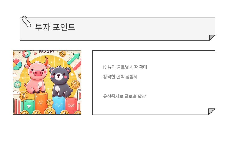 최근 주가가 급등하며 3만 원대 중반에서 움직이고 있으며, 1년 전 8,680원이었던 주가와 비교하면 약 259% 급등한 상태입니다. K-뷰티 글로벌 성장과 해외 시장 확장 기대감이 반영된 결과로 보입니다.