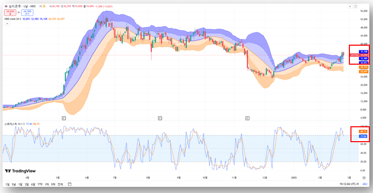 • 현재 주가는 볼린저 밴드 상단 근처에서 움직이고 있음