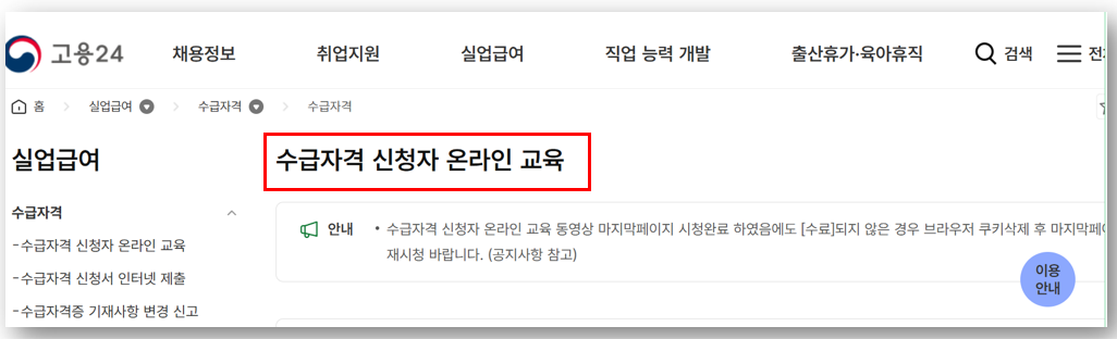 - 실업급여 제도에 대한 교육은 수급자격 신청 전에 반드시 받아야 합니다.