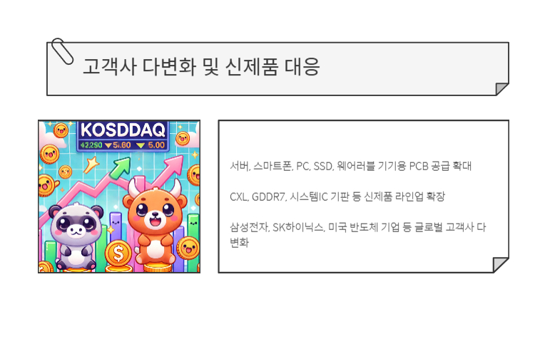 - 삼성전자, SK하이닉스, 미국 반도체 기업 등 글로벌 고객사 다변화