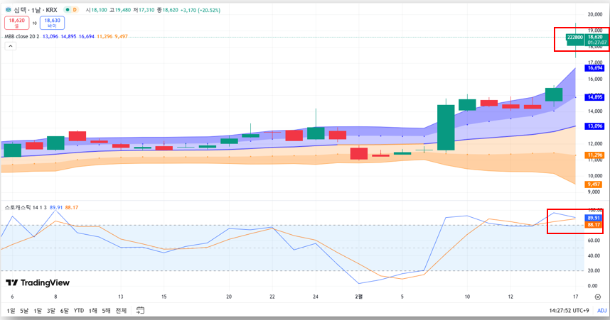 - 스토캐스틱 지표: %K 89.81, %D 88.17 → 과매수 구간 진입